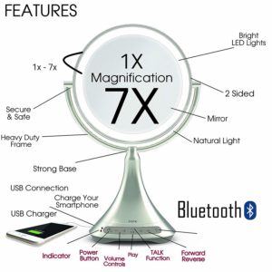 – Need to make a call while you’re getting ready? The mirror has bluetooth and easily connects with your phone. Your calls go through the speaker in the base of the mirror. The mirror picks up your call, just like the bluetooth in a car.